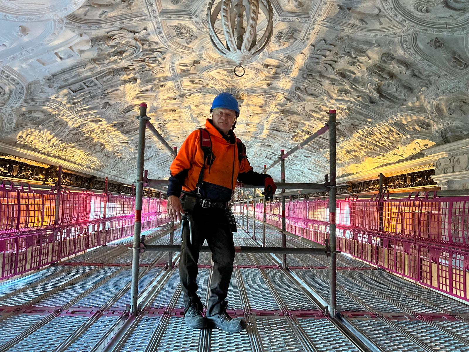 To support its conservation, our team designed and installed a bespoke birdcage scaffold that filled the entire gallery, giving heritage experts the stable, secure platform they needed to carry out delicate repairs to the original plasterwork. What made this scaffold truly special was not just the precision of the installation, but the experience it enabled. For the first time in the gallery’s history, visitors could walk directly beneath and alongside the ceiling—face-to-face with its detail. As Liz Green, Senior National Curator for Architectural History at the National Trust, remarked in the episode: